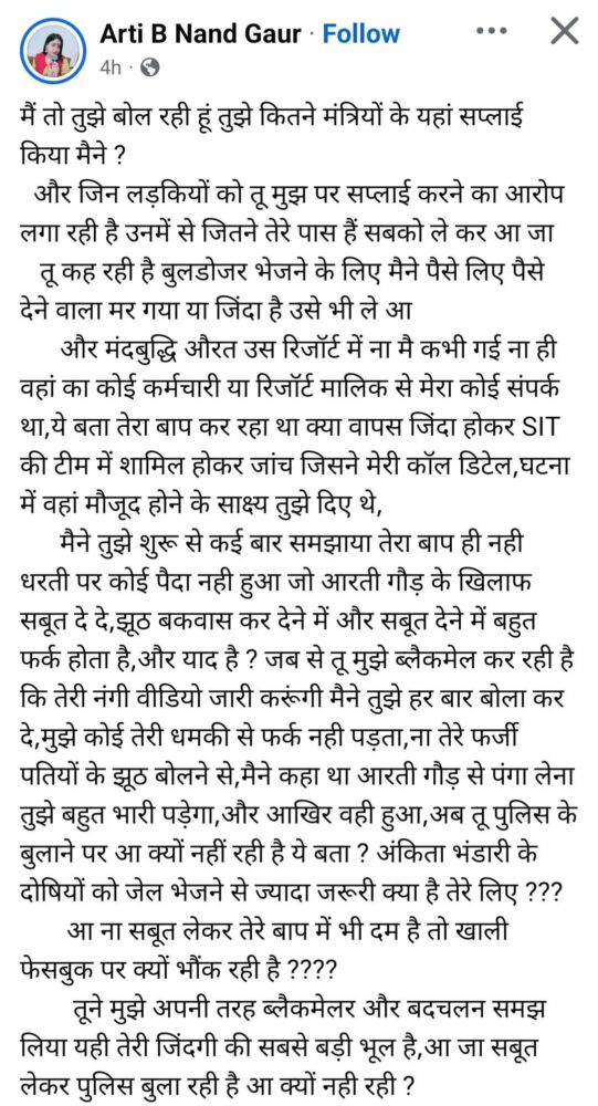 अभिनेत्री उर्मिला सनावर के बयानों की सनसनी के बीच आरती गौड़ का धमाका : कहा खाली फेसबुक पर भौंक रही साक्ष्य हैं तो पुलिस को उपलब्ध क्यों नहीं कराती? इस प्रकरण पर महेंद्र भट्ट सुरेश राठौर और गणेश गोदियाल के वक्तव्य भी