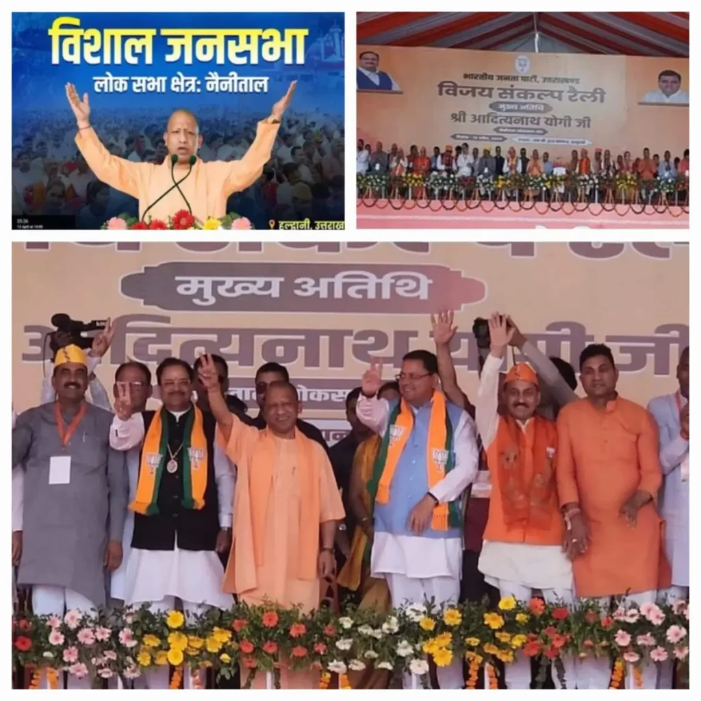 हल्द्वानी (नैनीताल)- हल्द्वानी के एमबी इंटर कॉलेज में आयोजित भाजपा की विजय संकल्प रैली में उत्तर प्रदेश के मुख्यमंत्री योगी आदित्यनाथ पहुंचे। उनके साथ सीएम पुष्कर सिंह धामी भी मौजूद रहे। इस दौरान सीएम योगी ने हल्द्वानी के एमबी इंटर कॉलेज मैदान में एक विशाल जनसभा को संबोधित किया। इस दौरान भाजपा प्रत्याशी अजय भट्ट ने योगी और धामी की तारीफों के पुल बांधे और कहा कि यूसीसी और नकल विरोधी कानून बनाकर सीएम पुष्कर सिंह धामी ने इतिहास बना दिया है। भट्ट ने जमरानी बांध को मंजूरी मिलने को बड़ी उपलब्धि बताया। उन्होंने कहा कि अगर में दोबारा संसद में जाता हूं तो प्रदेश और क्षेत्र की नाक नीची नहीं होने दूंगा।